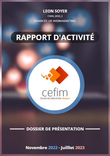 Rapport d'activités (2023) pour l'obtention du titre de chargé de webmarketing au CEFIM de tours.Ce rapport contient une grande partie des travaux issues du proejt avec TREPANATION RECREATIVE, mais aussi d'autres travaux réalisés pour GET KOLLAB, projet d'application mobile pour la création et la diffusion d'UGC en B2B.
